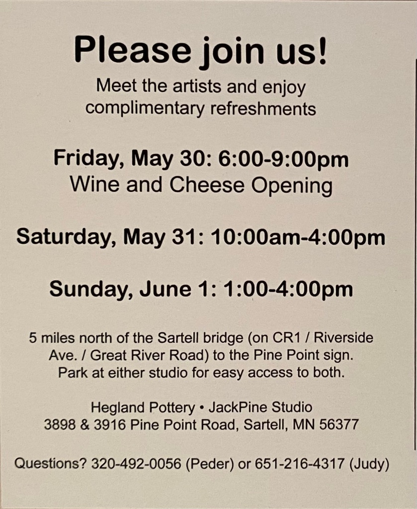 Please come to see the new collaboration works in Stoneware with mixed media by Judy Bergerson and Peder Hegland at The Ripple River Gallery, 27591 Partridge Ave, Aikin, Minnesota 56431, 218-678-2575, info@ripplerivergallery.com